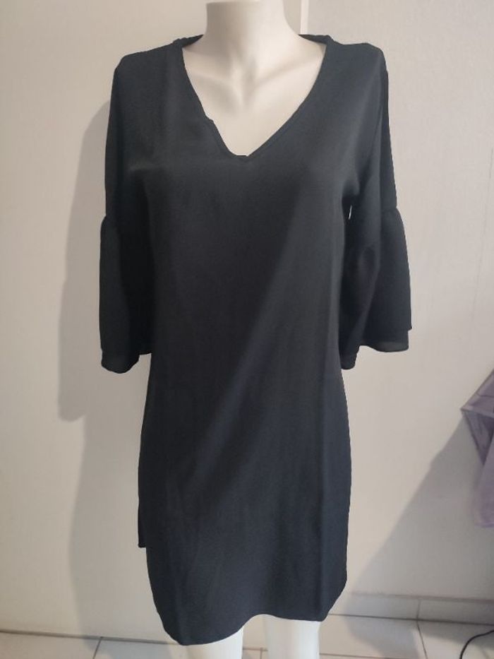 #kytie38femme. Robe manches 3/4 taille 38/40 sans marque col V en voile avec volant sur les manches petite robe noire souple et fine mesure des épaules 40 cm mesure des aisselles 50 cm hauteur de la robe 90 cm longueur des manches des épaules jusqu'en bas 40 cm la robe est neuve de couleur noire