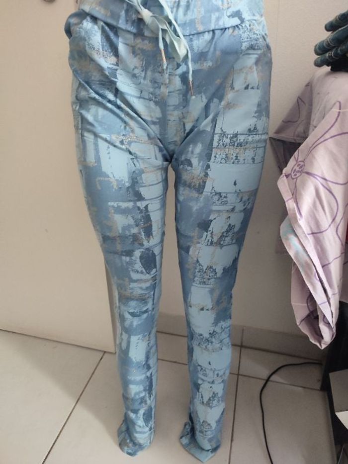 #kytieLfemme. Pantalon taille L/XL sans marque taille élastique avec le cordon le cordon a un peu changé de couleur mais bon ça se change on peut mettre à la sève bleu ciel argenté ou bleu turquoise étant donné que le pantalon est bleu clair pailleté argent ça y est élastique mesure de la taille 40 cm élastique tirer au max 42 tour de cuisse 54 cm longueur 100 cm tour de cheville 26 cm le pantalon est neuf avec des poches arrières 95 % coton 5 % élasthane