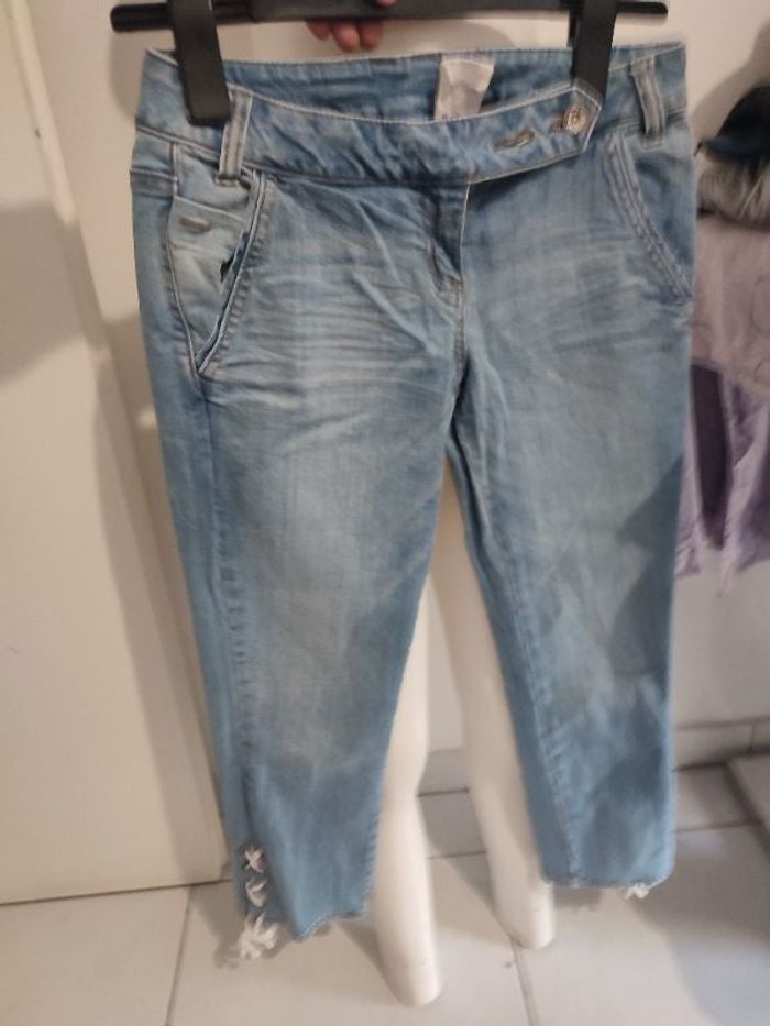 #kytie36femme. Pantacourt taille 36 de marque Camaïeu taille basse avec laçage en bas du pantacourt se ferme par 3 boutons et une fermeture éclair poche avant poche arrière mesure de la taille 36 cm tour de cuisse 50 cm hauteur taille bas 80 cm et le contour du bas et de 30 cm le pantacourt est en parfaite état