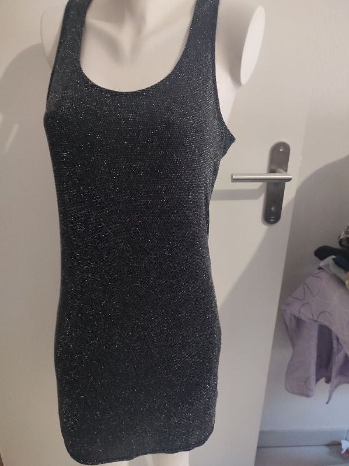 #kytieLfemme. Robe bretelles taille L de marque Kiabi de couleur noire pailleté argent col ront doublé la robe est fluide souple les mesures des aisselles et de 46 cm la longueur de la robe et de 90 cm la robe est comme neuve