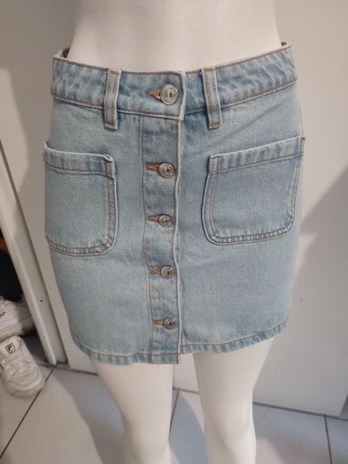 #kytie36femme. Jupe en jeans taille 36 de marque Jennifer la jupe et neuve avec des poches avant se ferme sur toute la hauteur devant avec des boutons mesures de la taille 36 cm en 44 cm hauteur 36 cm de couleur bleu ciel