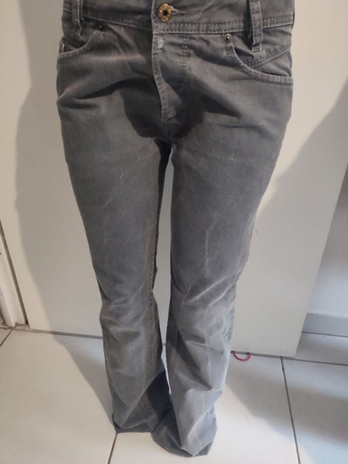#kytie40homme. Jeans taille 40 de marque fort success full living de couleur gris se ferme avec des boutons poche avant poche arrière griffé au niveau du premier bouton mais c'est à la mode jean droit confortable mesure taille 42 cm tour de cuisse 60 cm hauteur taille cheville 100 cm largeur de cheville 40 cm le jean étant parfait état de couleur gris clair un peu griffé entre les jambes et sur la taille au niveau de la ceinture à la mode