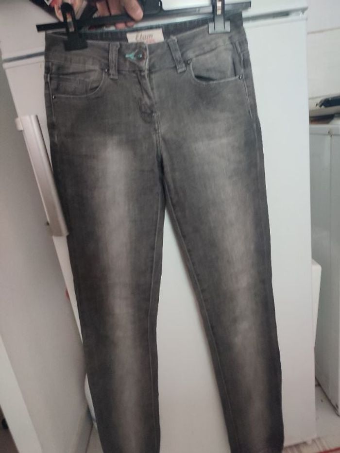 #kytie32femme. Jeans taille 32 de marque Etam deux couleurs gris blanchies et bleu turquoise zippé avec un bouton taille élastique mesure de la taille 32 cm tour de cuisse 50 cm longueur taille cheville sans cm poche avant poche arrière en très très bon état