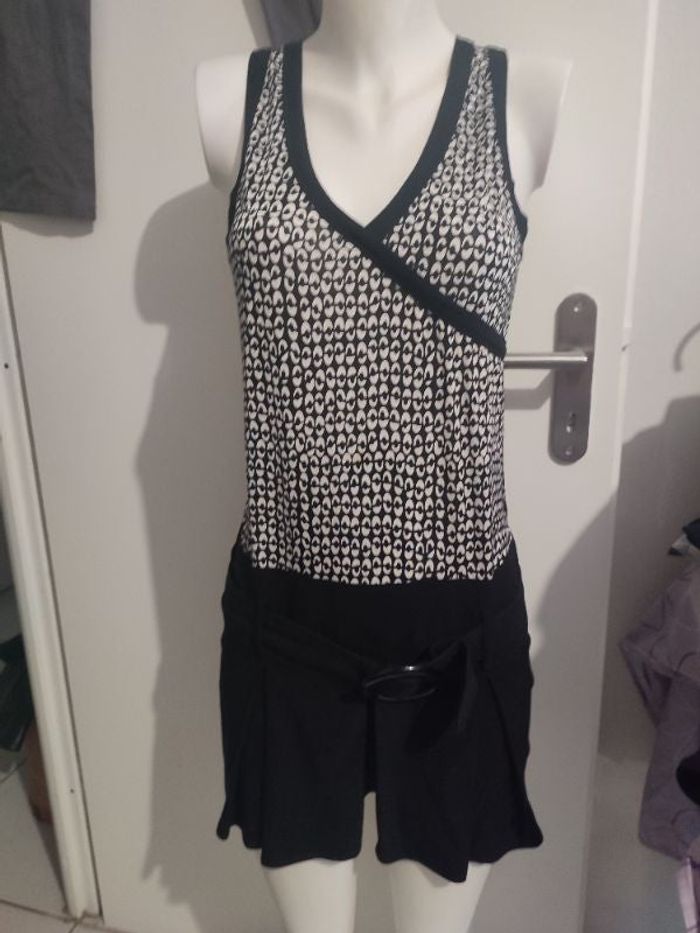 #kytieXSfemme. Robe sans manche taille XS sans marque col V cœur croisé cousu en polyester et en coton et en élasthanne le haut est très léger le bas de la jupe est avec un élastique français avec ceinture incorporée mesure épaules a épaules 30 centimètres esselles a esselles 36 centimètres hauteur épaules bas 85 cm se ferme par une fermeture éclair sur le côté au niveau de la jupette et c'est quand même une marque Morgan en excellente état jamais porté de couleur noire et blanche un peu sixties années 70/ 80