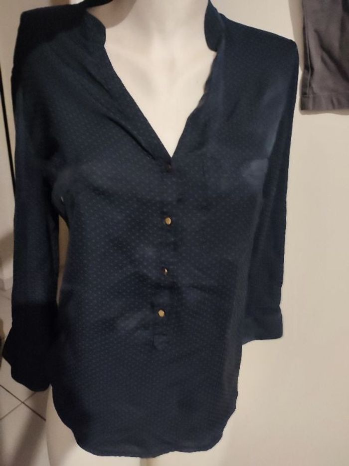 #kytieSfemme. Chemise blouse manches longues taille S de marque Zara col V avec de petits boutons miroir couleur dorée/bronze surpiqué au niveau de la poitrine poche avant du côté gauche de couleur bleu marine moucheté bleu pétrole les manchots sont retroussables par un petit bouton et le poignet se ferme par deux petits boutons miroir très légère et très souple très fine en parfaite état de matière 100 % polyester mesure épaules a épaules 40 centimètres esselles a esselles 48 centimètres hauteur épaules bas 60 cm