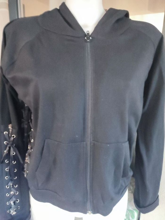 #kytie32femme. Gilet sweat à capuche manches longues taille 32 de marque de marque balance neuf poche avans massage sur les manche sur fausse fourrure léopard hyper douce capuche doublé fausse fourrure léopard hyper douce de couleur noir et beige mesure esselle a esselle 50 cm hauteur épaule bas 50 centimètres