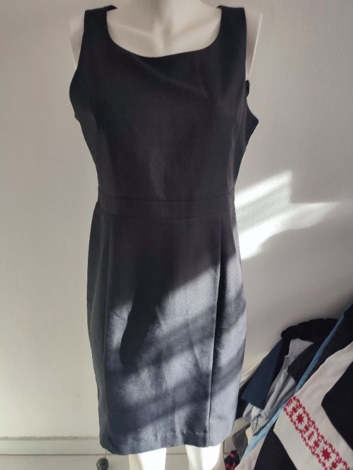 #kytie42femme. Robe sans manche taille 42 de marque Kiabi de couleur noir se ferme par une fermeture éclair dans le dos neuve en polyester et 2 % elasthane mesure esselle a esselle 50 centimètres hauteur épaules bas 95 centimètres tissus mat mi saison surpiqûres au niveau de la poitrine devans et a la taille style ceinture oh top très classe robe droite