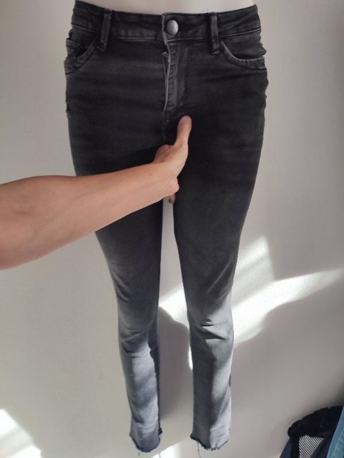 #kytie36femme. Jeans 👖 taille 36 de marque cache cache poche avans et arrière se ferme par une fermeture éclair et un bouton devans en coton et elasthane griffé sur les cuisses bas cheville effilé comme neuf en excellente état de couleur noir gris anthracite mesure taille 36 centimètres tour de cuisse 54 centimètres hauteur taille bas 95 centimètres