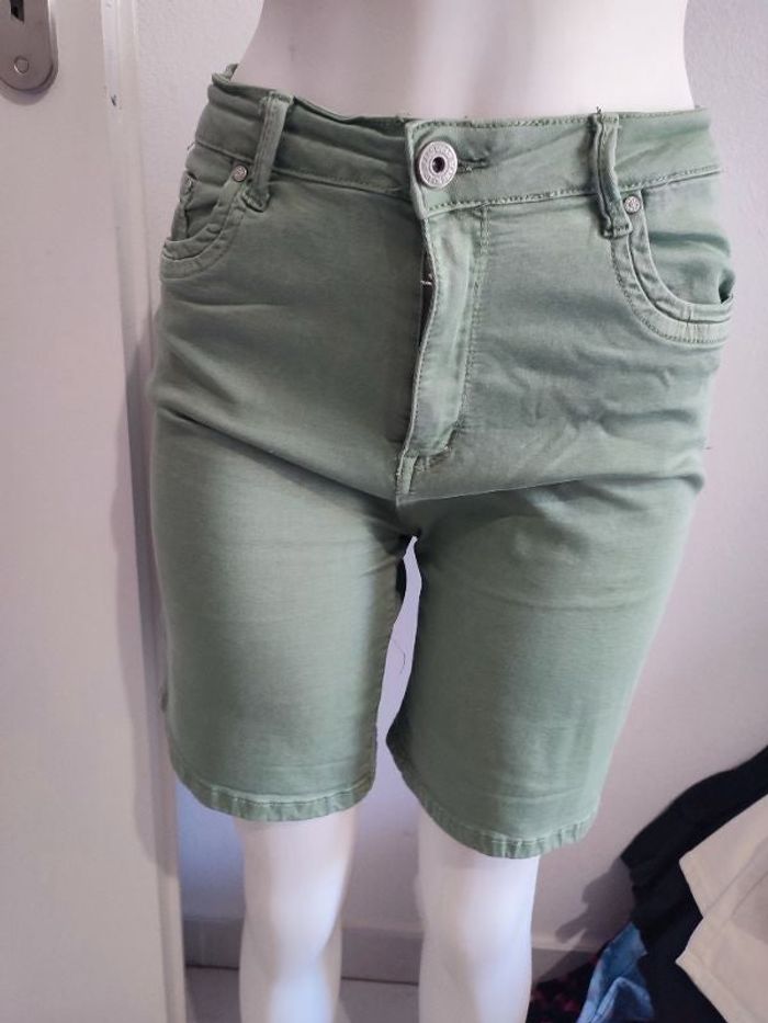 #kytie42femme. Bermuda taille 42 de marque ana et Lucy neuf de couleur vert se ferme par une fermeture éclair et un bouton devans mi saison poche avans et arrière mesure taille 38 centimètres hauteur taille bas 45 centimètres tour de cuisse 60 cm 98% cotton 2% elasthane