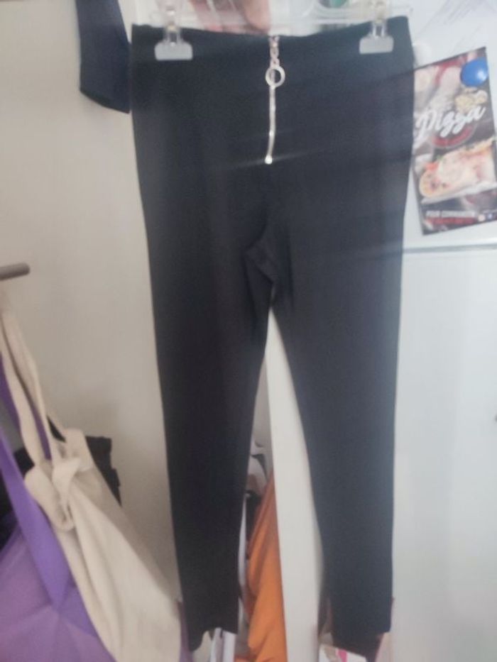 #kytieXSfemme. Pantalon legging taille XS de marque Kiabi de couleur noir se ferme par une fermeture éclair sur le devans taille élastique mesure taille 32 centimètres tour de cuisse 50 centimètres hauteur taille bas 86 % bas cheville serrer en parfaite état 61% viscose 34% polyamide 5% elasthane mi saison car un peu épais
