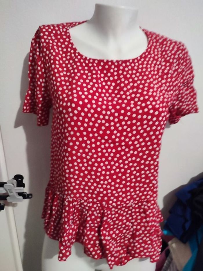 #kytieSfemme. Tunique blouse taille S de marque Mango pin up neuf manche courte avec volant sur le bas se ferme par un petit bouton dans le coup au dos de couleur rouge a poid blanc mesure épaules a épaules 36 centimètres esselles a esselles 46 cm hauteur épaule bas 60 cm