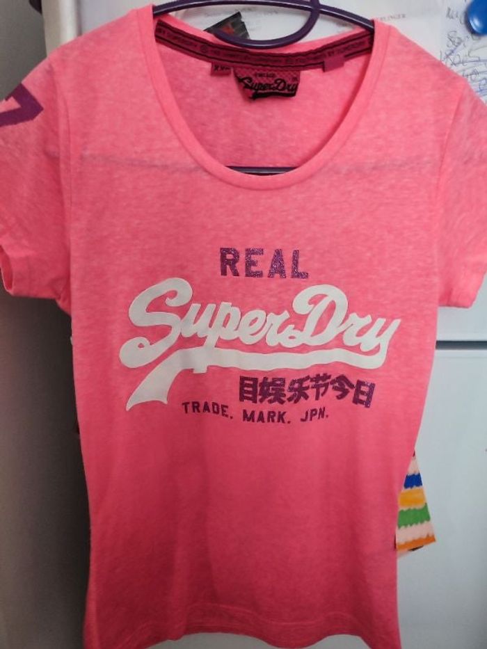 #kytieXXSfemme. T-shirt manches courtes taille xxl de marque Superdry col rond mi-saison de couleur rose flashy blanc et violet pailleté rose mesure épaule à épaule 33/34 cm esselle a esselle 36 cm hauteur épaule bas 60 cm le t-shirt est neuf et en élasthanne