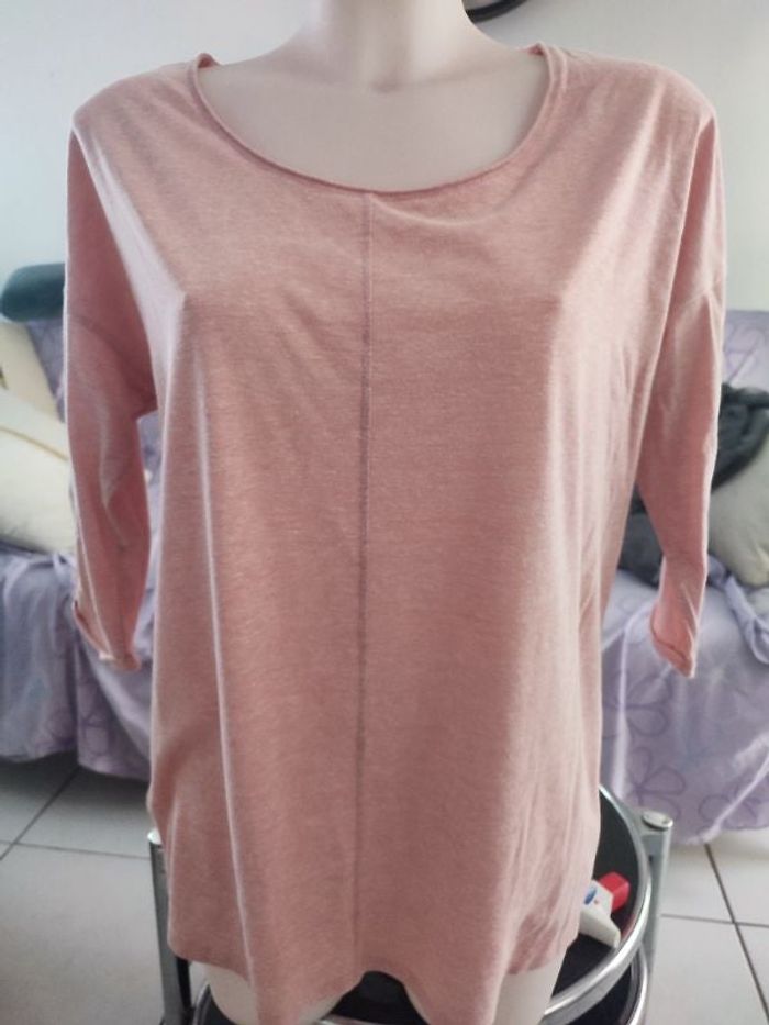 #kytie44femme. Tee-shirt manches 3/4 taille 44/46 de marque Promod col V de couleur rose pastel en coton super doux en Exellente état revers sur le bas des manches surpiqûres sur le bas au milieu mesure épaules a épaules 62 centimètres esselles a esselles 58 centimètres hauteur épaules bas 65 centimètres fluide et léger