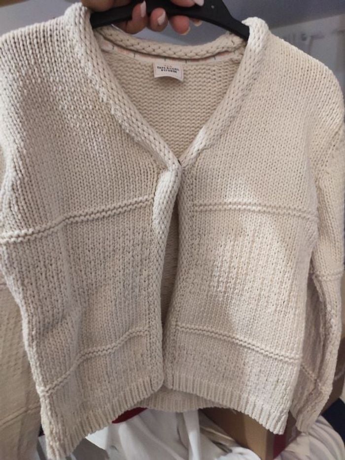 #kytie8ansfille. Gilet cardigan manche longue taille 8 ans de marque tape a l'oeil de couleur écru en maille point mousse et gersey manche longue se ferme par un bouton pression en parfaite état