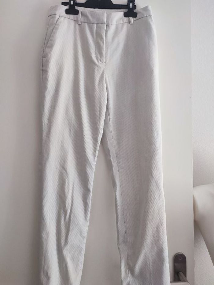 #kytieXShomme. Pantalon shino taille XS de marque HetM neuf de couleur blanc pigmenté gris noir c'est-à-dire pigmenter c'est-à-dire que le tissu est blanc avec effet en dessous gris noir voilà hyper doux poche avant fausse poche arrière se ferme par un bouton une accroche et une fermeture éclair le pantalon est neuf mi-saison mesure taille 36 cm tour de cuisse 50 cm et hauteur taille bas cheville 95 cm