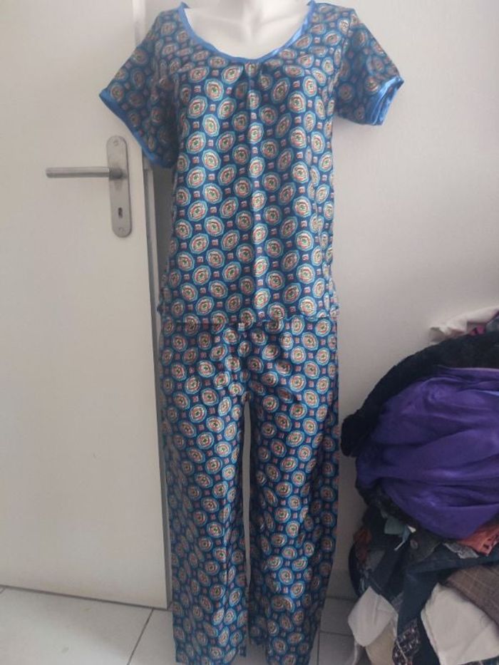 #kytie34femme. Ensemble taille 36/40 fait main satiné chemise blouse manches courtes liseret satin bleu col V pantalon taille élastique très beau pour sortir dehors ou la maison très léger neuf mesure du haut épaules a épaules 44 centimètres esselles a esselles 44 centimètres hauteur épaules bas 62 centimètres pantalon taille 32 centimètres élastique tiré au max 44 cm tour de cuisse 60 cm hauteur taille bas 90 cm bas droit