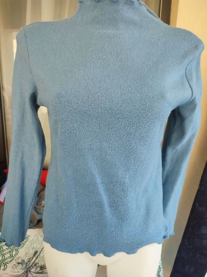 #kytieSfemme. Polaire manches longues taille S col montant elastiqué au col et au bas des manches et du pull de couleur bleu clair en elasthane mesure épaules a épaules 36 centimètres esselles a esselles 44 centimètres hauteur épaules bas 55 centimètres en super état de marche sans nom