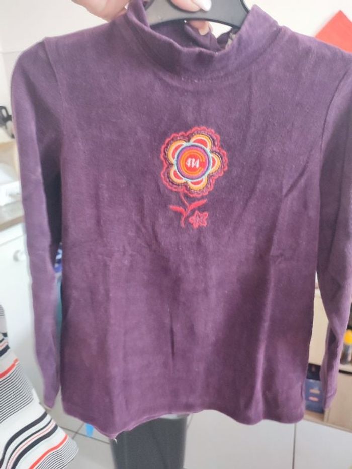 #kytie6ansfille. Pull tunique manches longues taille 6 ans de marque 414 en vélo à côtelé légèrement col montant en parfaite état de marque 414 avec petite fleur brodée sur le devant