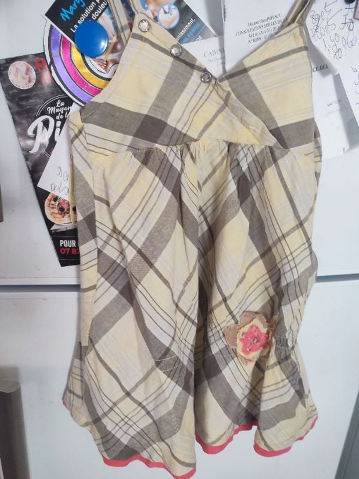 #kytie6ansfille. Tunique taille 6 ans de marque on the town de couleur jaune pastel gris avec trois petits boutons sur le col V on a crystal effet miroir transparent bretelle réglable se ferme par une fermeture éclair du côté gauche avec une petite fleur surpiquée sur le devant en bas en très bon état