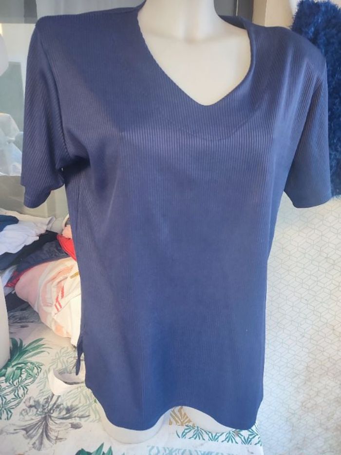 #kytie42femme. T-shirt manches courtes taille 42/44 colle V arrondi vers le bas surpiqûre en dessous du col tissu côtelé de couleur bleu marine matière style maillot de foot mi-saison en superbe beta mesures et Paul à épaule 44 cm esselles à aisselles 54 cm hauteur 65 cm avec épaulettes en mousse que l'on peut retirer en les coupant au superbe etat effet brillant fluide souple hypert confortable