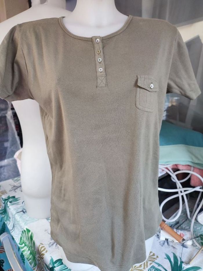 #kytie40femme. T-shirt manches courtes taille 40 /42 de marque claire delande de couleur kaki col rond avec petit bouton nacré 100 % coton mesure épaule à épaule 42 cm esselle a esselle 46 cm hauteur épaule bas 65 cm en excellente état comme neuf sur l'étiquette écrit 50/52 mais taille hyper petit