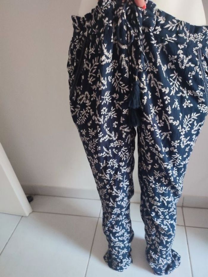 #kytieSfemme. Pantalon taille S ⚠️ taille super large de marque Mango tissus côtelé tissu très fin taille élastique avec cordon petit pompon au bout un petit peu large aux cuisses mesure taille 50 cm faut vraiment serrer la taille il aura un effet gonflant aux cuisses bouffant et plus serré vers le bas poche avant le pantalon est neuf casual de couleur bleu marine et blanc mesure à tour de cuisse 65 cm hauteur taille cheville 100 cm