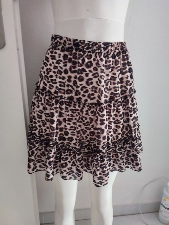 #kytie34femme. Petite jupe taille 34 de marque new collection évasé sur piqué volant tissu léopard très fine et très légère très souple tout neuf de matière 100 % polyester mesure taille 34 cm élastique tirer au max 42 cm hauteur de la jupe 40 cm
