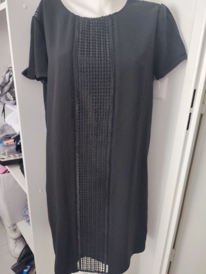 #kytie42femme. Robe manche courte taille 42 de marque Promod 85 % coton et polyester doubler avec broderie sur le devant et en haut du dos elle est comme neuve s'attache par un petit couteau dans le cou à l'arrière reverse sur les manches courtes mesure épaule à épaule 44 cm esselles a esselles 54 cm et hauteur de la robe épaule bas 95 cm de couleur noire comme neuve tissu effet gaufré minusculement très discret mi-saison légère et très confortable