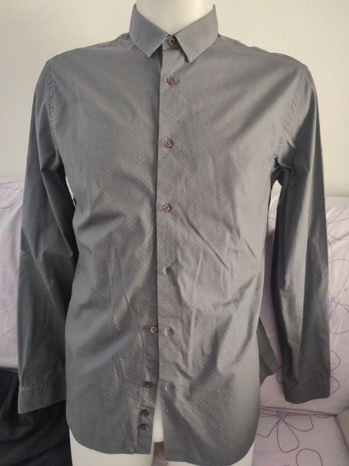 #kytieLhomme. Chemise manche longue taille L de marque Célia de couleur grise avec croisillon fondu dans la couleur de la chemise très discrèt se ferme par des boutons devans 100% cotton souple mesure épaules a épaules 46 centimètres esselles a esselles 50 centimètres hauteur épaules bas 70 centimètres en parfaite état