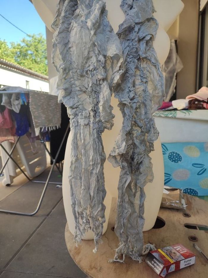 #kytieaccessoirefemme. Écharpe taille unique de couleur gris clair nacré en fil toute élastique longueur de 230 cm neuve 100% viscose en frange sur le bas froncé de partout trop mignonne