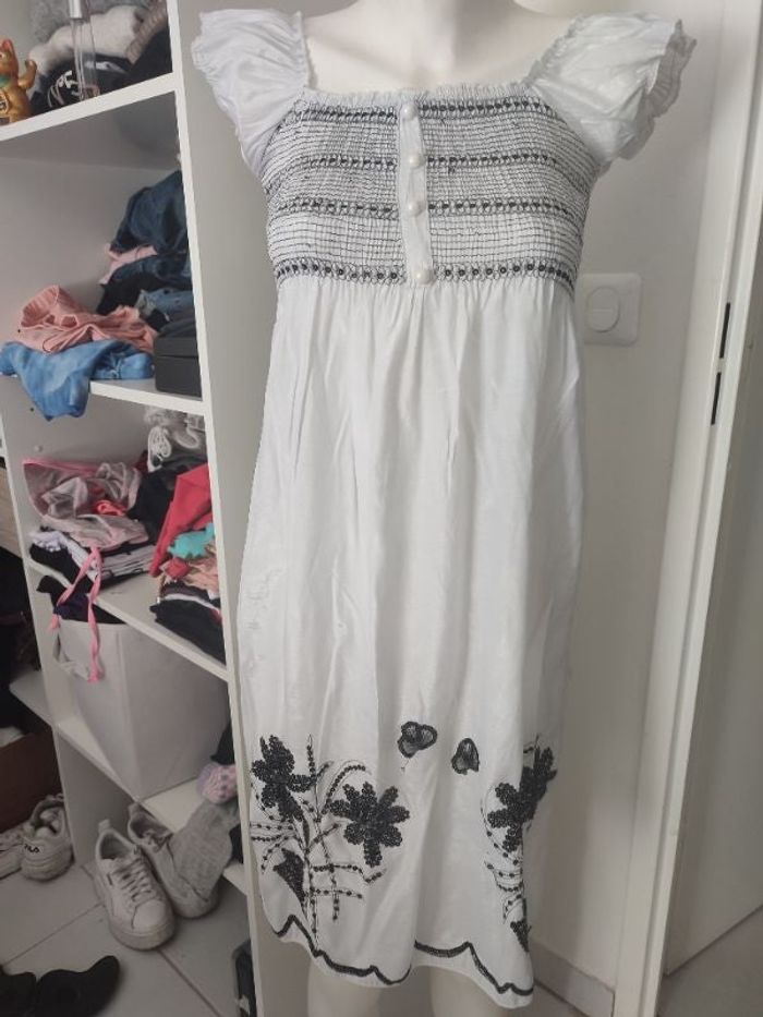 #kytieXSfemme. Robe mi longue petite manche taille XS/S de marque subtlety de couleur blanche et noir le blanc et en lamé nacré fluide et souple bustier élastique devans et dos mesure esselle a esselle 34 centimètres hauteur épaules bas 100 centimètres légèrement transparente sequin fleurie noir sur le bas comme neuve