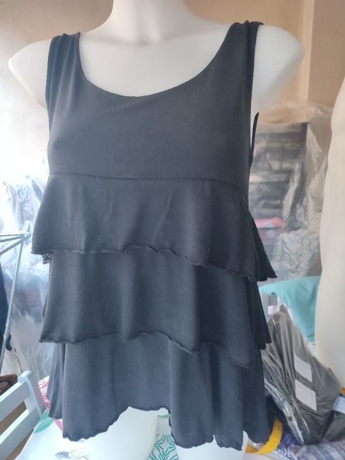 #kytie38femme. Haut a bretelles taille 38 de marque cache cache doublé a volant en très très bonne état de couleur noir mesure esselle a esselles 42 centimètres hauteur épaules bas 60 cm