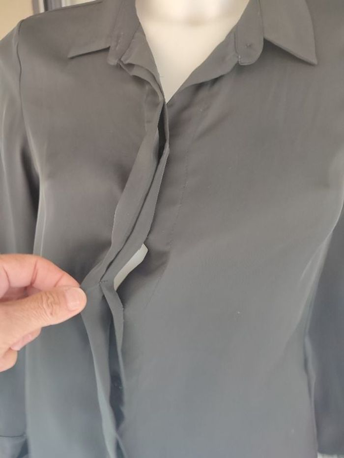 #kytie34femme. Chemisette manche longue taille 34 de marque HetM neuve de couleur noir en voile légèrement brillant se ferme par des boutons devans avec revers mesure épaules a épaules 36 centimètres esselles a esselles 40 centimètres hauteur épaules bas 65 centimètres