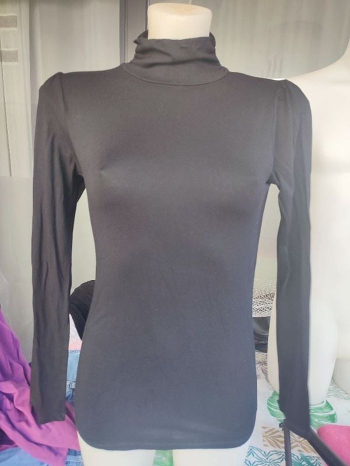 #kytieSfemme. Col cheminée manche longue taille S de marque camaïeu en elasthane de couleur noir surpiqûres au niveau du coup en superbe état mesure épaules a épaules 34 centimètres esselles a esselles 38 centimètres hauteur épaules bas 60 cm