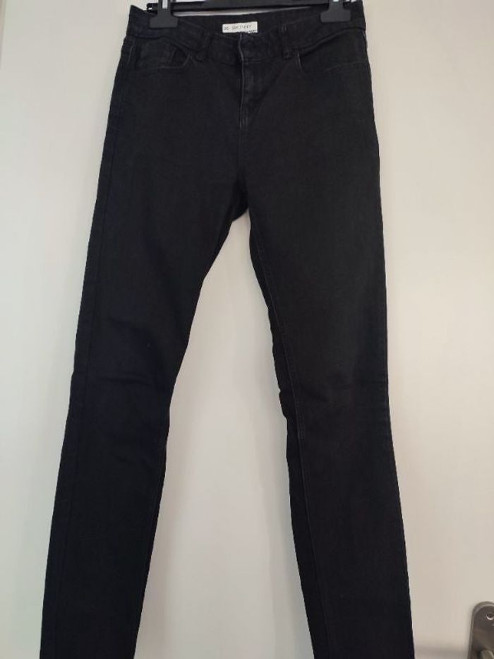 #kytie36femme. Skinny jeans taille 36 de marque Kiabi de couleur noir se ferme par une fermeture éclair et un bouton devans poche avans et arrière mesure taille 36 et hauteur taille bas 95 centimètres entre jambe cuisse 25×2 centimètres en elasthane comme neuf