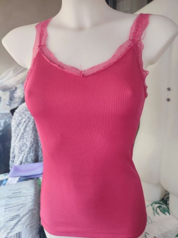 #kytie32femme. Débardeur taille 32 de marque women only lycra côtelé col V en dentelle et elasthane comme neuf rose fushia mesure esselle a esselle 30 centimètres hauteur épaules bas 60 cm
