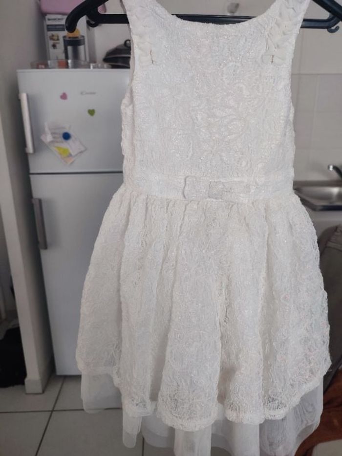 #kytie3ansfille. Robe bretelles taille 3 ans de marque orchestra de couleur blanche en dentelle fleurie avec les fleures en 3 D nacré rose tulle en dessous doublé comme neuve