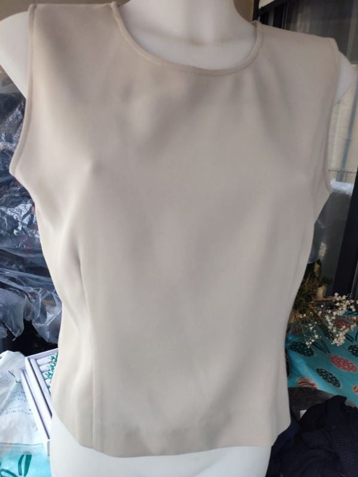 #kytieLfemme. Top sans manche taille L de couleur beige de marque Paul Harris design 100% polyester hyper souple tissu cotelé hyper fine surpiqûre sur le devans mesure épaules a épaules 36 centimètres esselles c A esselles 50 centimètres hauteur épaules bas 50 centimètres se ferme par un petit bouton dans le dos en haut au coup état neuf