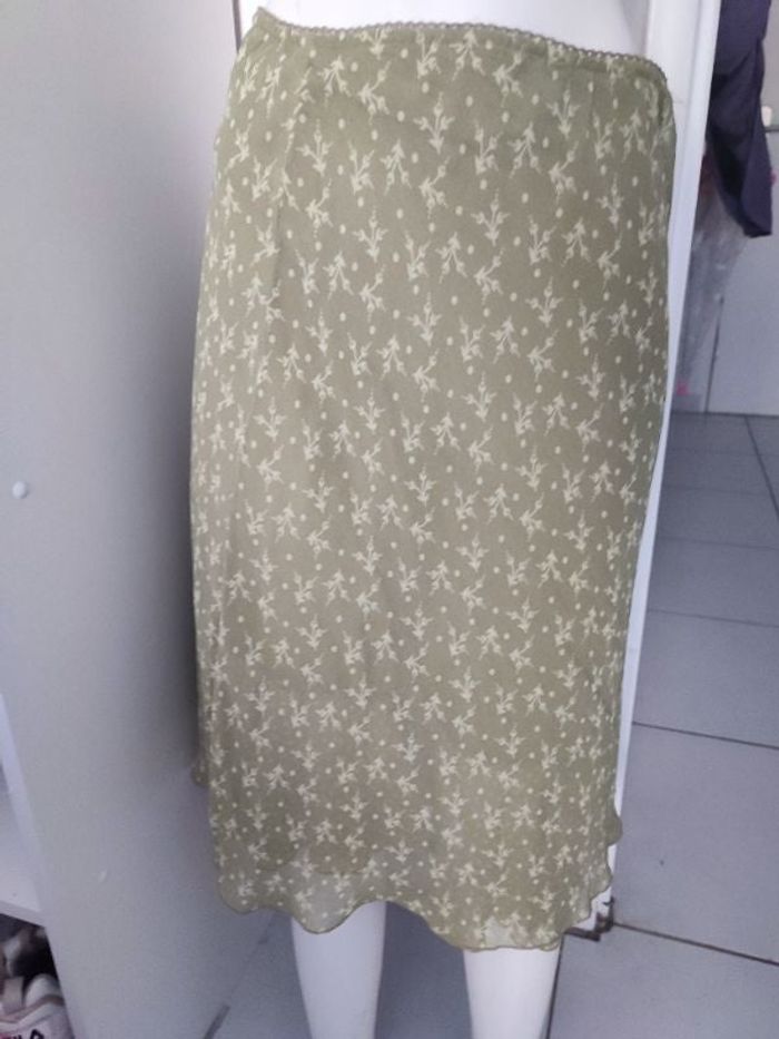 #kytie38femme. Jupe mi longue taille 38/40 de marque Kiabi de couleur vert fleuri en voile doublé avec un volant en sous le voile taille élastique fluide et légère mesure taille 40 centimètres hauteur taille bas 70 centimètres en état excellent