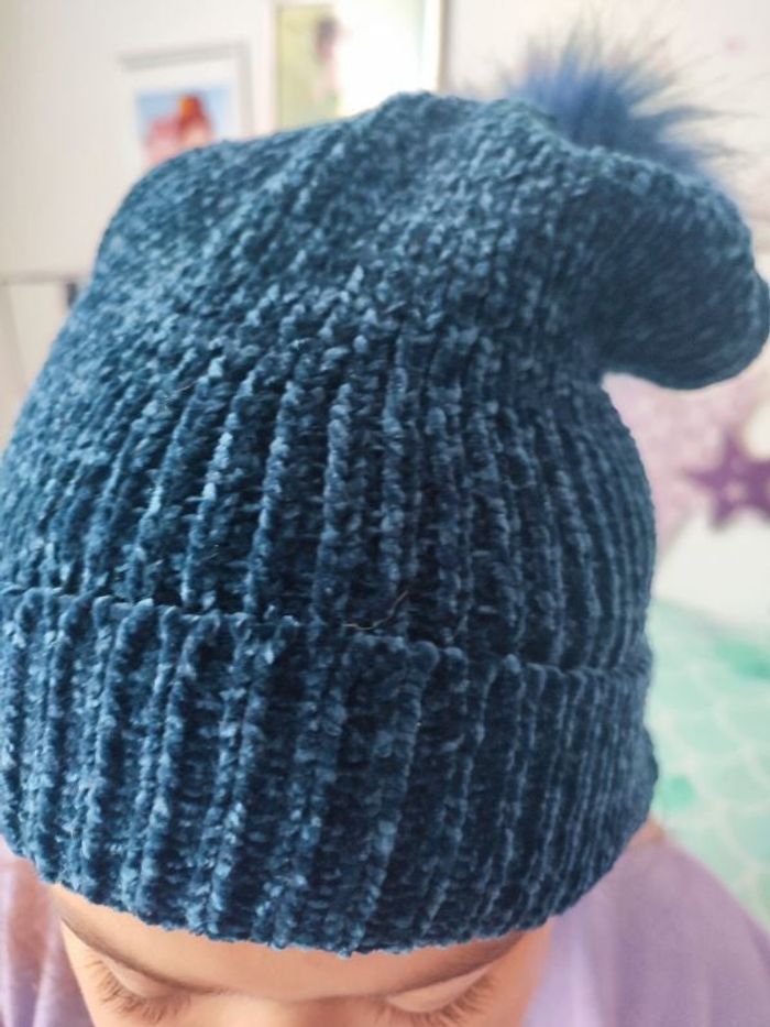 #kytieaccessoirefemme. Bonnet avec ponpons en fausse fourrure de couleur bleu maille laine chenille élastique très doux peux aller aussi bien à un enfant que a une femme neuf mesure tour de tête 40 centimètres taille M