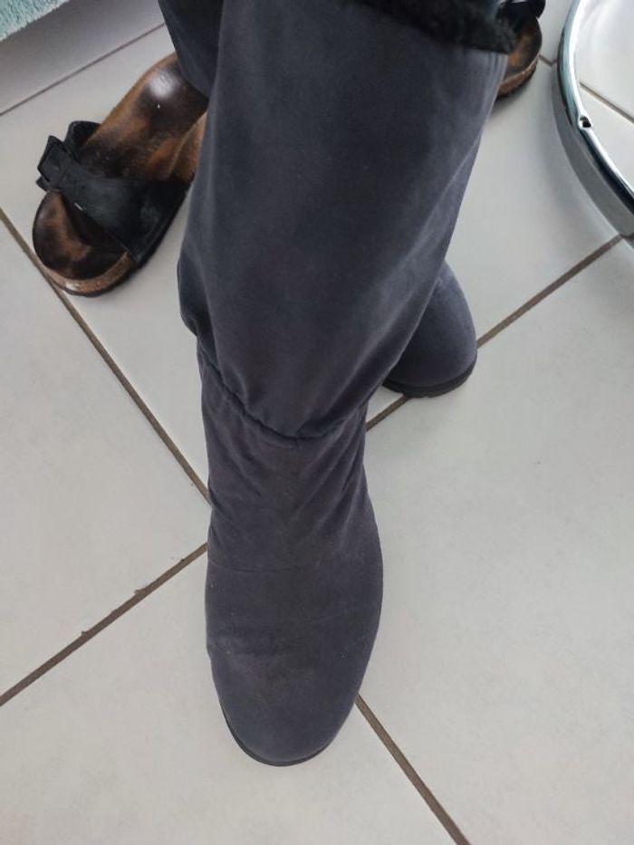 #kytie39chaussurefemme. Boots taille 39 avec petit compensées de 4,5 centimètres en nylon velour ras super douce de couleur grise avec élastique a la cheville surpiqûre sur le dessus de la bottes moutonné a l intérieur tien très chaud retroussable sur la bottes noir ou pas .hyper confortable de marque sympatex