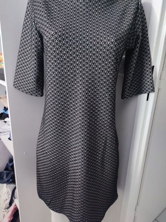 #kytie40femme. Robe taille 40 mi manche tissus mi saison de couleur noir et blanche marque inconnue en superbe état voir neuve se ferme par une fermeture éclair dans le dos en col V mesure épaules a épaules 40 centimètres esselles a esselles 45 centimètres hauteur épaules bas de la robe 👗 92 centimètres largeur bas de la robe 55×2 centimètres longueur des manches ecoudes 32 centimètres tissu en elasthane gouffré 😊