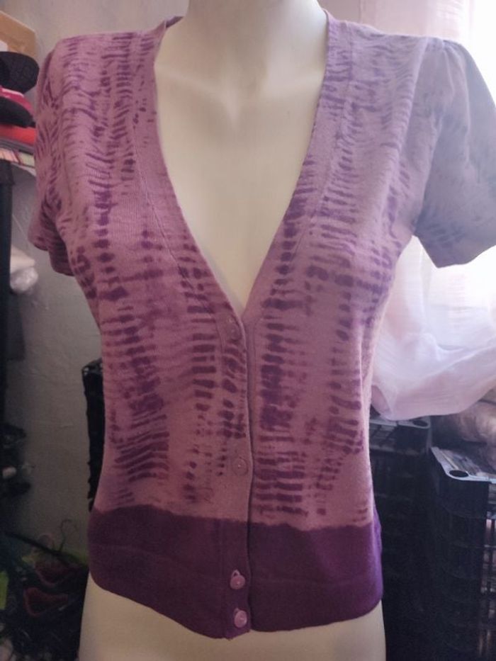 #kytieMfemme. Cardigan manche mi courte taille M avec petit bouton sur les manches se ferme par des boutons devans de marque original clothing matière 45% coton et en elasthane mesure épaules a épaules 38 centimètres esselles a esselles 45 centimètres hauteur épaules bas 58 centimètres souple et léger de couleur violet et parme comme neuf