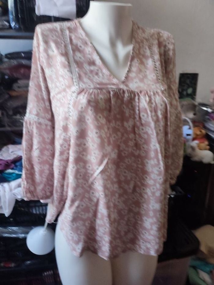 #kytie34femme. Tunique blouse taille 34 de marque By coco col V de couleur rose pastel fleurie 🌺🌸 avec de la transparence sur les manche 3/4 bas élastique évasée légère trop belle et hyper confortable mesure épaules a épaules 34 centimètres esselles a esselles 55 centimètres largeur bas 75 centimètres hauteur épaules bas