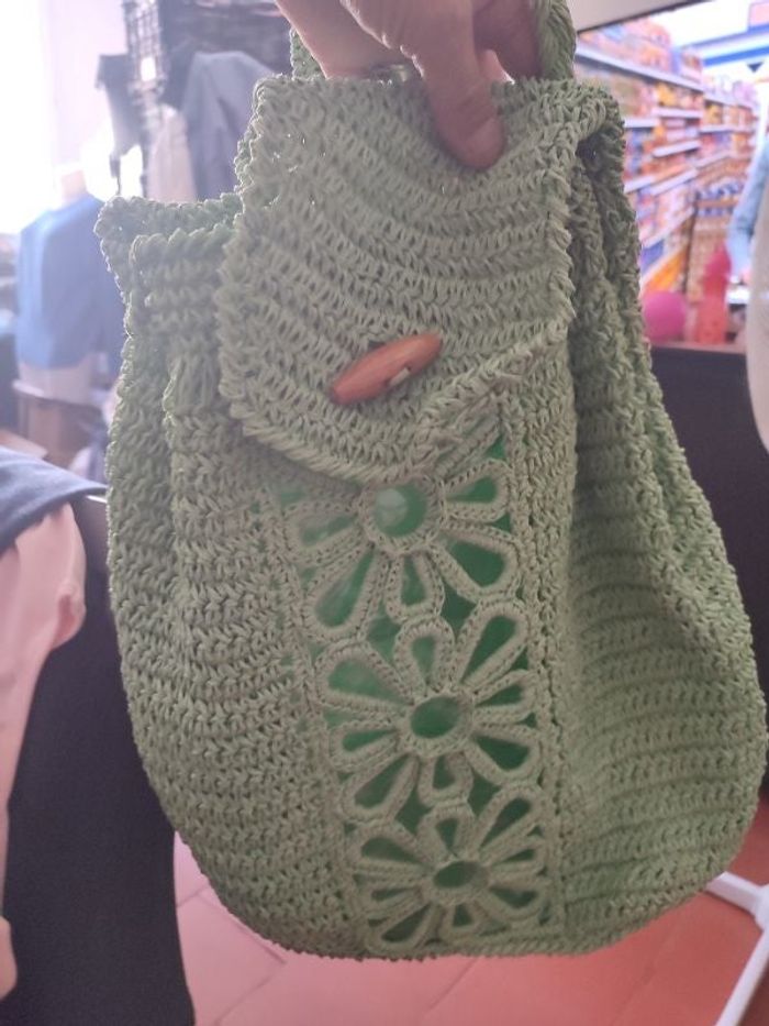 #kytieaccessoiresacfemme. Sac a dos en macramé de couleur vert menthe en superbe état se ferme par un bouton en bois plastique rigide intérieur sous la fleur manière réglable intérieur doublé tissu marque sans fait main de créateur mesure haut du rabac bas 40 centimètres largeur du sac 35 centimètres intérieur souffler bas25 centimètres sur 10 centimètres