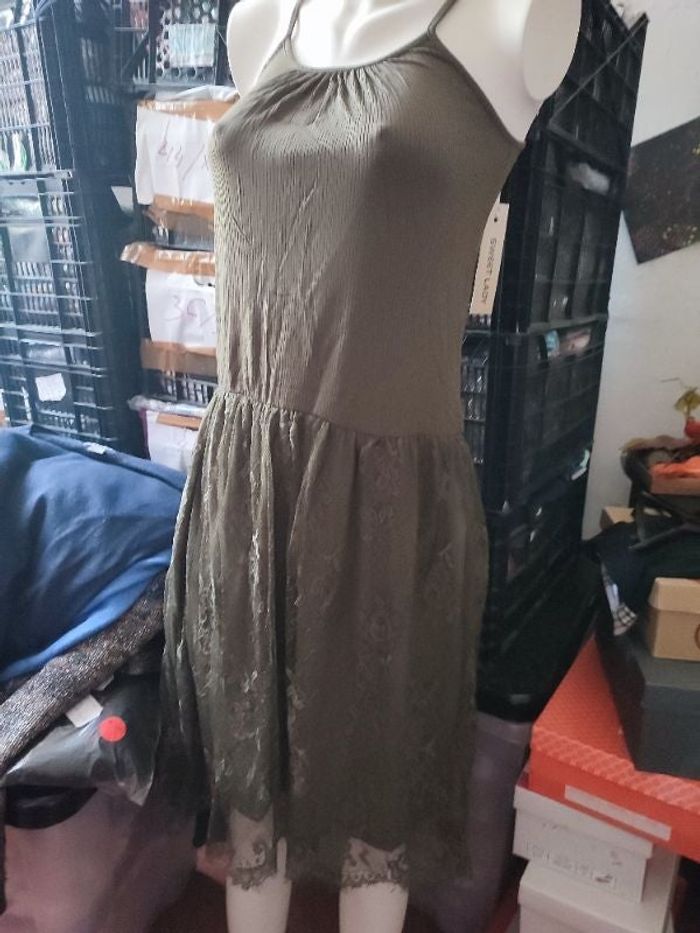 #kytieLfemme. Robe bretelles taille L/XL de marque sweet lady de couleur kaki a bretelles réglables col rond surpiqué sur le devans tissu côtelé plat en haut en elasthane le bas en dentelle doublé hyper hyper légere et pas transparente mesure de la robe esselles a esselles 32 centimètres haut esselles mi robe taille 35 centimètres hauteur total bretelle bas 95 centimètres mesure de la dentelle hanche bas 60 centimètres superbe hyper légère fluide tissu 60 %coton 30 %viscose et 10%elasthane 😊🤩largeur de la robe bassin 35×2 centimètres