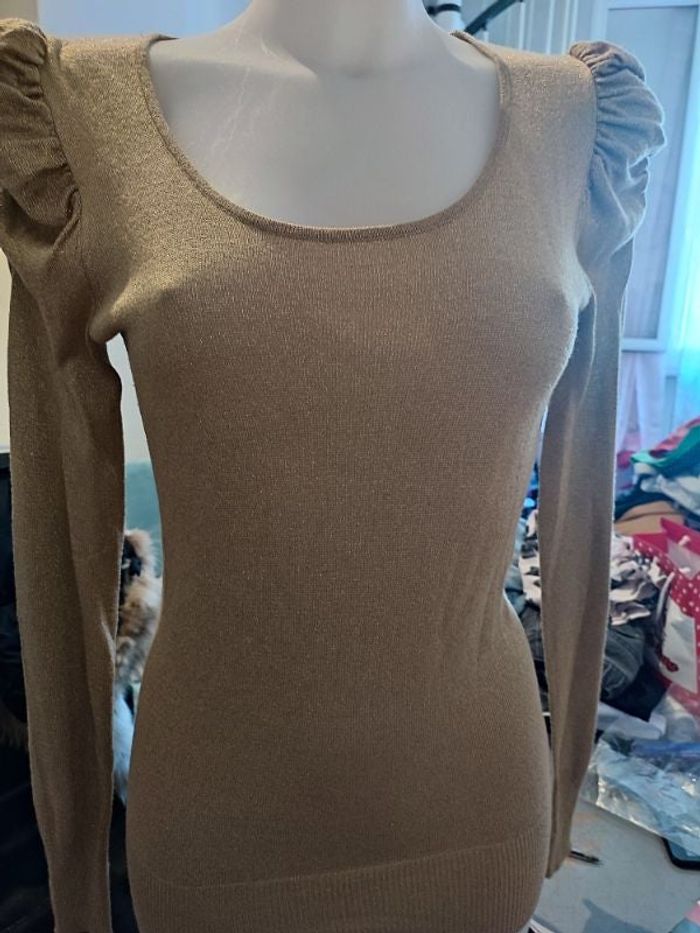 #kytie34femme. Haut manche longue taille 34 super fin pas transparent avec surpiqure frou frou sur le haut des épaules longueur 60 centimètres de marque camaieu de couleur dorée en parfaite état voir neuf