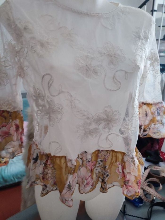 kytie38femme. Top court taille 38/40 transparent en broderie devans et derrière en voile avec le bas en voile fleurie neuf manche 3/4 fluide de marque stellah longueur du top 50 centimètres