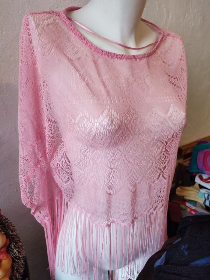 #kytietailleuniquefemme. Top manche courte taille unique mais vas de 36 au 42 max a frange de marque Kiabi neuf de couleur rose col rond transparent longueur du col a avans les franges 40 centimètres du haut en bas 60 centimètres neuf