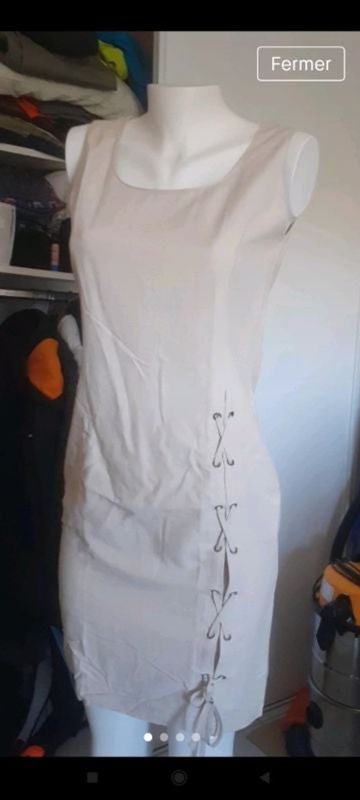 #kytie38femme. robe debardeur en lin taille 38/40 de couleur beige doublé satin leger de marque canda se ferme par une fermeture eclair dans le dos longueur fermeture eclair 38 cm longeur esselle a esselle 44 cm epaule a epaule 35 cm hanches 45 cm longueur robe coup bas 80 cm decoration a gauche de la robe lassage en lin aussi robe neuve